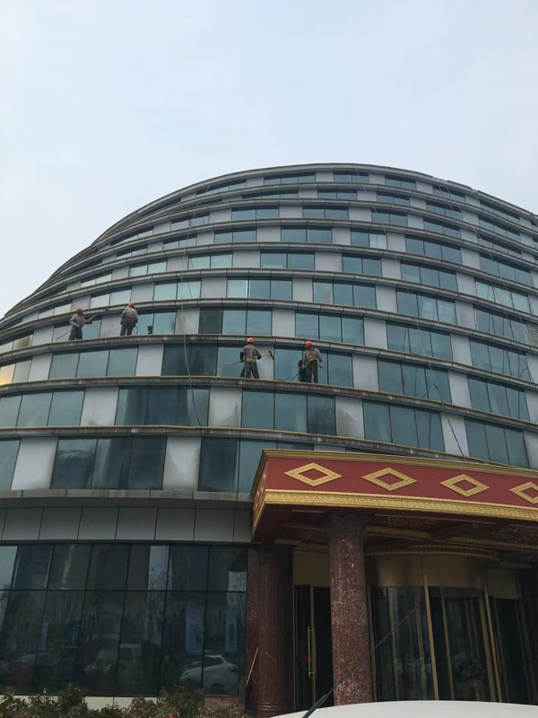 首先,用專業(yè)清洗工具配合清潔劑清洗,清除外墻和玻璃上的污垢,然后用高壓清洗水槍,沖洗掉外墻上的污漬及污垢,并反復(fù)擦洗,用清水沖洗污垢,直至清洗到玻璃表面無積垢,